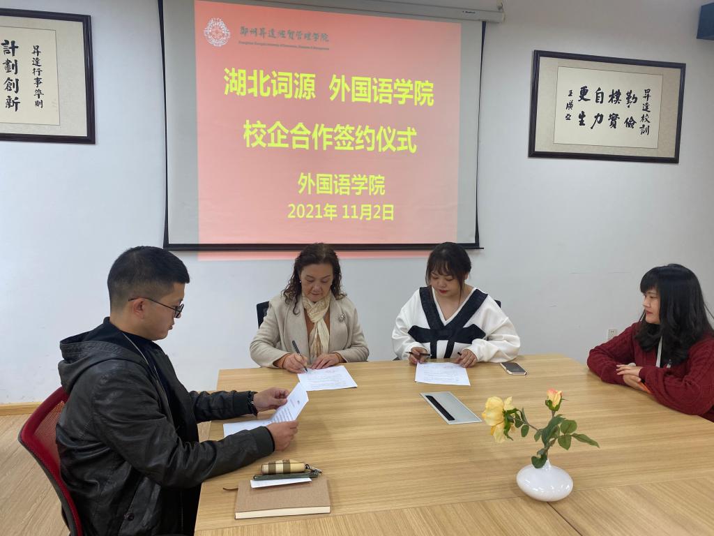 张梦院长简要介绍了学院的历史沿革、学科发展、专业建设、人才培养等情况,就公司对学院的信任表示感谢,就双方的产学研用合作前景提出希望并给予美好祝愿。湖北词源教育的李亚谕老师介绍了公司的情况,对学院的学科专业实力给予充分肯定,希望能在原有交流的基础上深入合作,发挥双方优势、互惠双赢。双方签署了《校企合作协议书》。