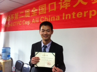 在3月24日举行的第二届“中译杯”全国口译大赛河南河北大区赛上,我院09级口译一班吴洋同学努力拼搏,沉着应战,在参赛的两省14所高校的共41名选手中脱颖而出,喜获三等奖。