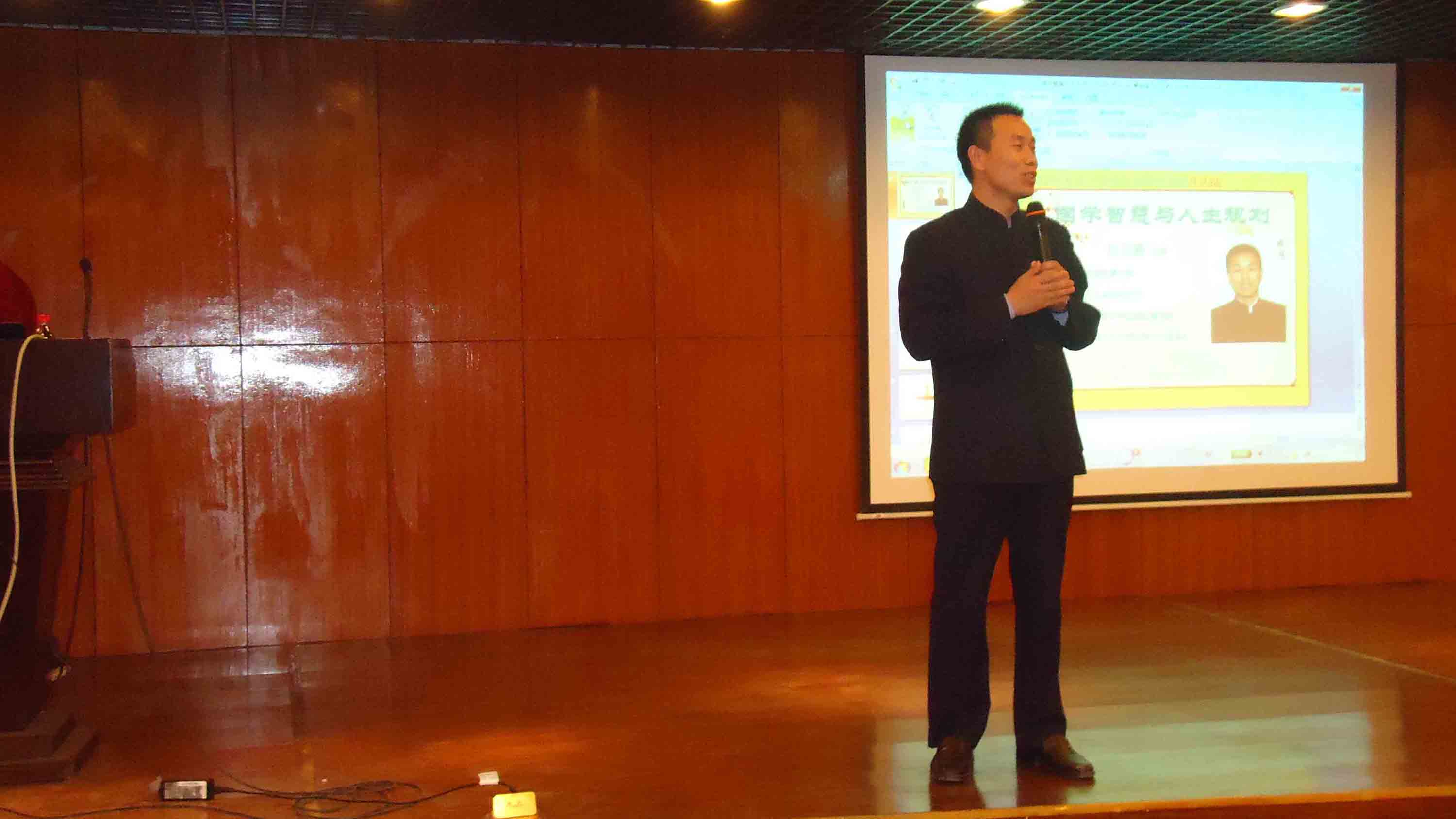 4月12号晚6:00,应外语系邀请,河南省国学文化促进会资深讲师焦金鹏老师,在外语楼二楼多功能报告厅为11级同学做了一场题为《国学智慧与人生规划》的讲座。河南省国学文化促进会副秘书长王福祺、张英两位老师,以及外语系党总支副书记石皓召、行政秘书兼团委书记惠凯赟参加了此次讲座。