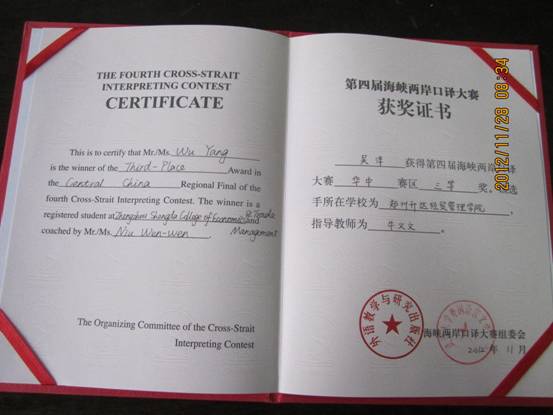 此次大赛是由厦门大学和外语教学与研究社联合主办,属于国务院台湾事务办公室重点交流项目规划。作为国内最权威的口译赛事,大赛采用专业的赛制和赛程,并邀请了国内口译界权威人士担任评委。参赛选手来自武汉大学、华中科技大学、中南大学、安徽大学等全国重点院校,其中,不少选手是口译专业硕士。一本、二本、三本高校之间,研究生和本科生之间,不同层次的选手同台竞技,高手如云,淘汰率高,竞争十分激烈。比赛分为主旨口译、对话口译及会议口译三个环节,对参赛选手的短期记忆力、口译技能、知识储备等进行考查,具有很大的挑战性。最终,三位选手凭借着扎实的语言基本功和娴熟的口译技巧,取得了好的成绩。值得一提的是,河南省参与本次大赛的五所高校(河南科技大学、中原工学院、中原工学院信息商务学院、河南财经学院成功学院及我院)13名选手中,我院外语系张静同学成为名次最高的选手,是河南省参赛选手中唯一获得二等奖的选手。