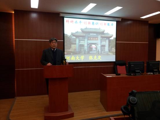 3月7日下午,河南大学张克定教授应我院外语系邀请,为外语系全体教师作了题为“科研水平·创新意识·创新能力”的精彩学术报告,讲座由教研室主任廖智英副教授主持,外语系全体教师聆听了此次学术讲座。